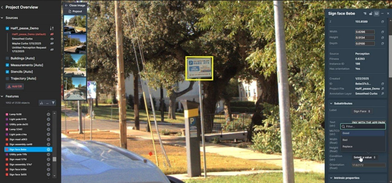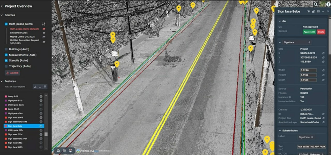 Additionally, the AI extracted road features from the mobile mapper’s data, including road striping, curbs and edges of pavement. All this enhances surveying precision and efficiency.